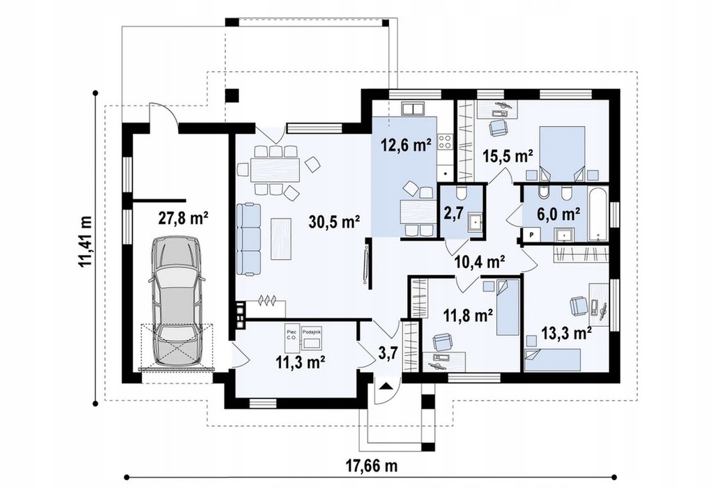 wiatrołap: 3,7m2, hall: 10,4m2, pokój dzienny: 30,5m2, kuchnia 12,6m2, łazienka: 6m2, podręczna toaleta 2,7m2, 3 sypialnie 11,8m2, 13,3m2 i 15,5m2
