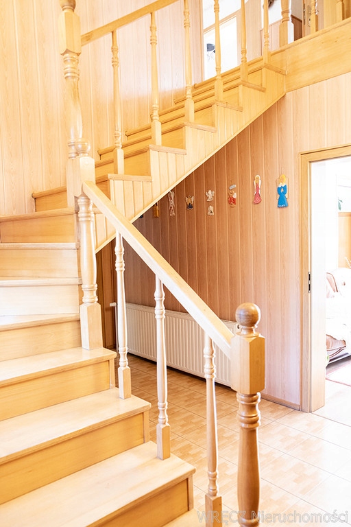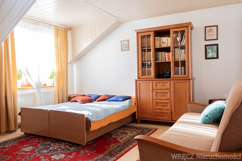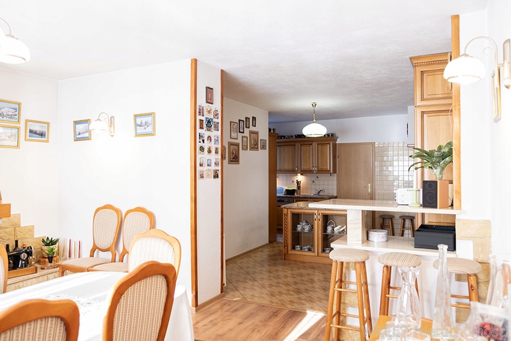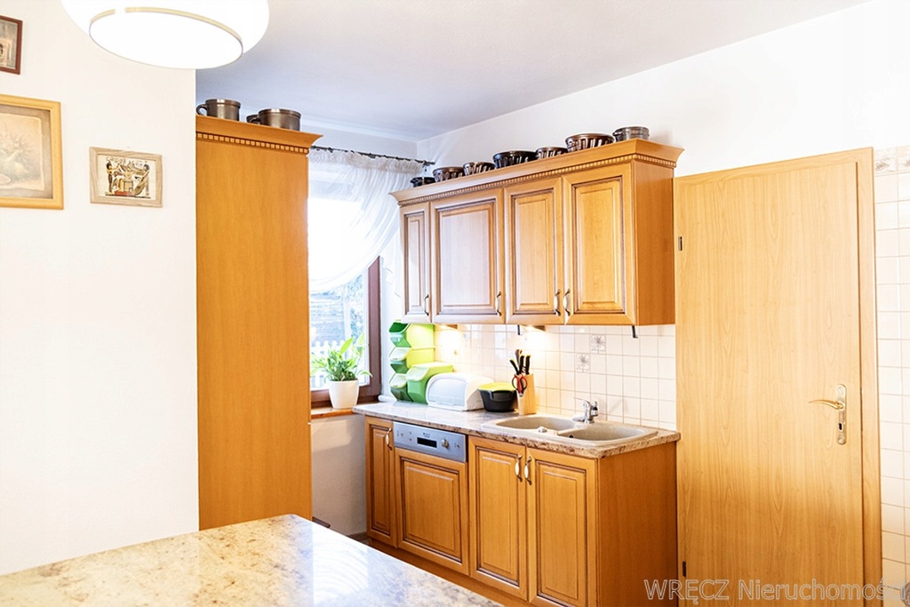 Dom posiada dwie kondygnacje, 7 pokoi (5 na piętrze), otwartą osobną kuchnię, 3 łazienki z toaletą (w tym jedna łazienka gospodarcza - pralnia), na parterze i na piętrze - jedna z wanną narożną i kabiną prysznicową, schowek oraz pomieszczenie gospodarcze i niedużą piwnicę.