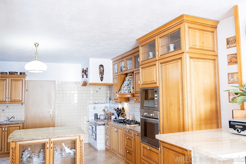 W kuchni znajduje się piękna, stara, czynna kuchnia węglowa, choć w tej chwili nie używana i pełniąca funkcję ozdobną. Używa się natomiast kuchenki gazowej, z funkcjami elektrycznej indukcji. Ze sprzętów AGD jest w zabudowie lodówka, piekarnik, kuchenka mikrofalowa, zmywarka.