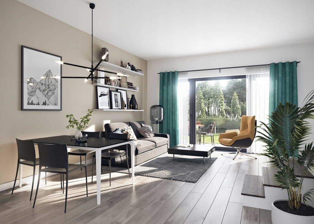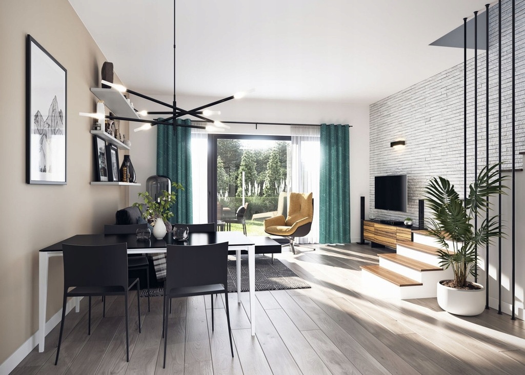 - salon połączony z kuchnią 34,21 m2, z wyjściem na taras z ogrodem