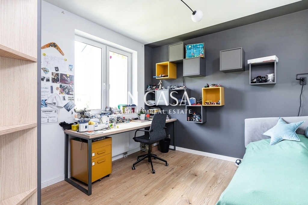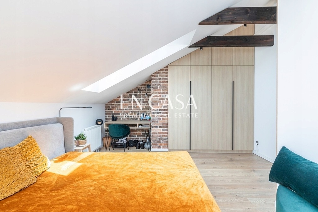 Na piętrze znajdują się dwie sypialnie, obecnie urządzone jako pokoje dziecięce oraz łazienka z wanną i zabudowaną pralnią. Na poddaszu otwarta sypialnia z zabudową pełniąca funkcję garderoby.