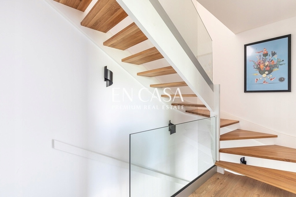On the first floor there are two bedrooms, currently arranged as children's rooms, and a bathroom with a bathtub and a built-in laundry room. In the attic, an open bedroom with built-in wardrobes.