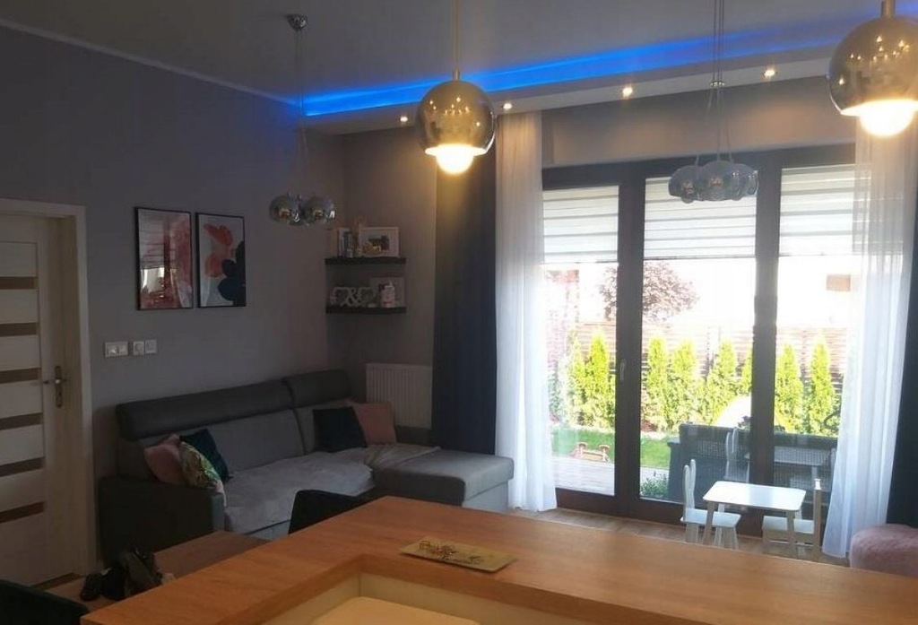 Pomiędzy szafkami szkło hartowane. Z salonu wyjście na taras i ogród, łącznie ok. 50 m2 powierzchni.