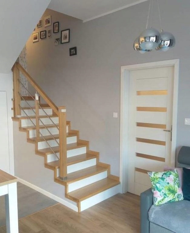 Wnętrze w nowoczesnym stylu, uroku dodają meble robione przez stolarza na wymiar, a także dębowe schody z lakierowanymi na biało podstopniami.