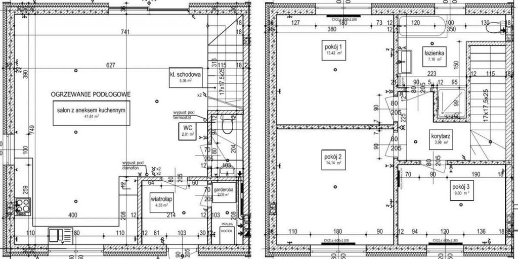Ogrzewanie podłogowe: w salonie, kuchni, wiatrołapie, wc i łazience.