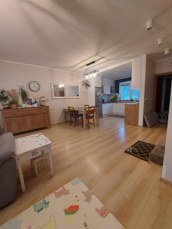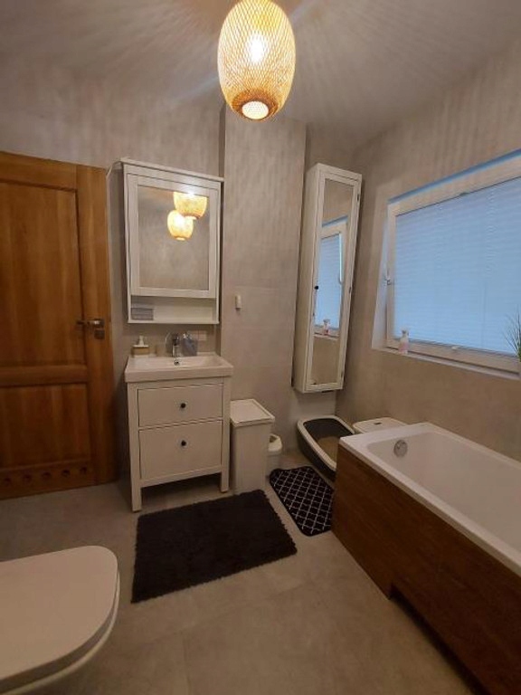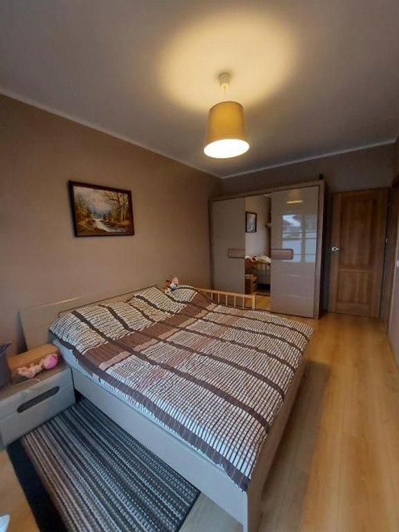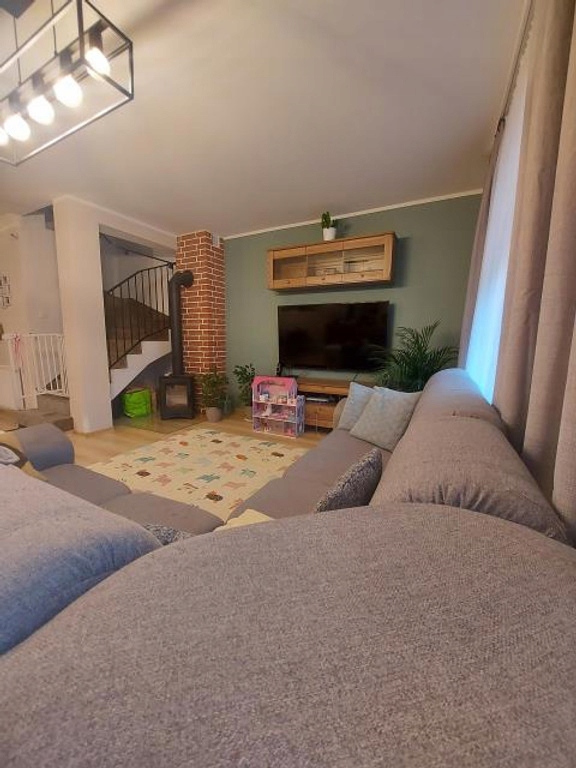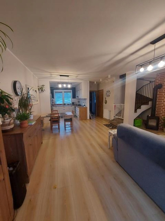 W sprzedaży dom o powierzchni 104 metry + 30 metrowe poddasze składający się z parteru gdzie mamy duży 34 metrowy salon z białą nowoczesną kuchnią. W salonie znajduję się strefa wypoczynkowa z tzw. nowoczesną kozą, telewizorem, narożnikiem, stolikiem. Łazienka z odpowiednio schowanym piecem gazowym oraz przedpokój. Na piętrze budynku znajdują się 3 sypialnie z szafami łózkami oraz nowocześnie urządzona łazienka łazienka z wanna i prysznicem. Całość domu urządzona ciepło i przytulnie gdzie dominuje kolor drzewa. Do lokalu przynależy ogród o powierzchni 160 metry w pełni zagospodarowany wraz ze zrobionym tarsem z kostki.