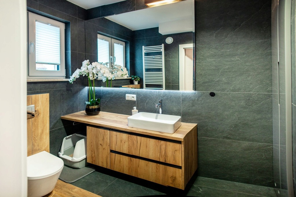 Łazienka z wanną i zabudową stolarską robioną przez stolarza.