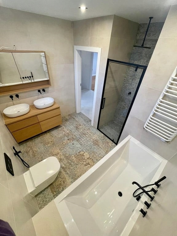 Wszędzie ogrzewanie podłogowe wodne, oprócz sypialni - w sypialniach kaloryfery