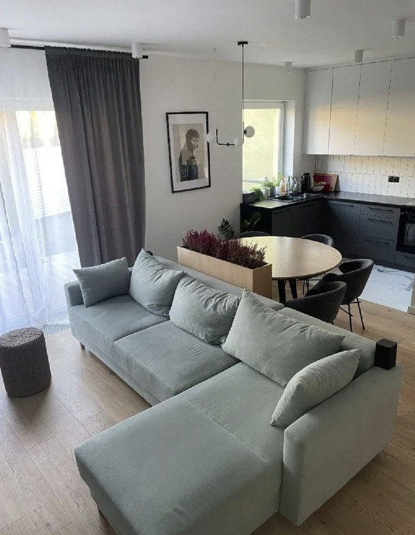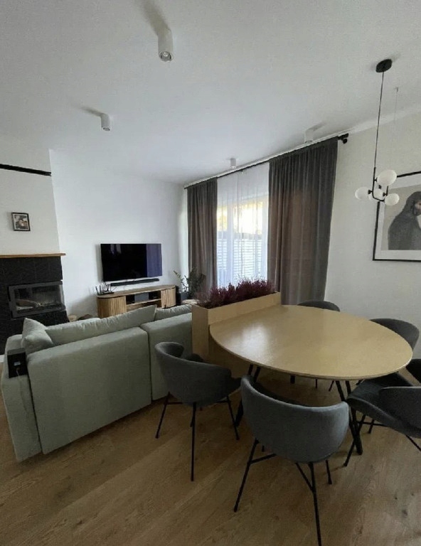 Salon z w pełni wyposażoną kuchnią (około 34m2) - w kuchni: lodówko-zamrażarka, piekarnik, płyta indukcyjna, mikrofalówka (wszystko na gwarancji). W salonie kominek, duża, rozkładana kanapa, wydzielona przestrzeń jadalna dla 5 osób. Meble na zamówienie mają 8 miesięcy. Z salonu można wyjść na ogród z tarasem (około 50m2). Taras z modrzewiu syberyjskiego - świeżo odnowiony po zimie.