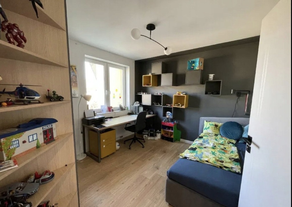 Pokój (około 12m2) - wykończony jako dziecięcy dla chłopca: duże biurko do nauki;