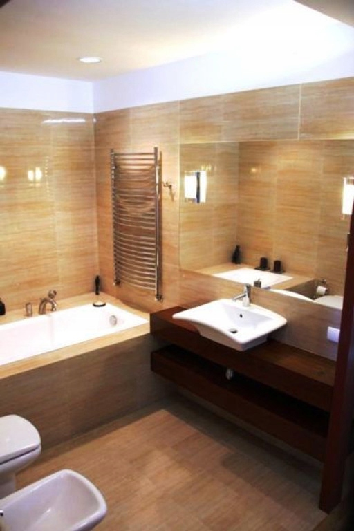 Przestronna, utrzymana w neutralnych barwach, łazienka wyposażona w wannę, umywalkę, wc i bidet oraz armaturę włoskiej firmy Zucchetti. Wyłożona gresem najwyższej jakości, przypominającym swym wyglądem trawertyn. Z elektrycznie podgrzewaną podłogą. Część łazienki wykończona została drewnianą podłogą, a funkcję blatu pod umywalką i półek pełnią meble z drewna egzotycznego.