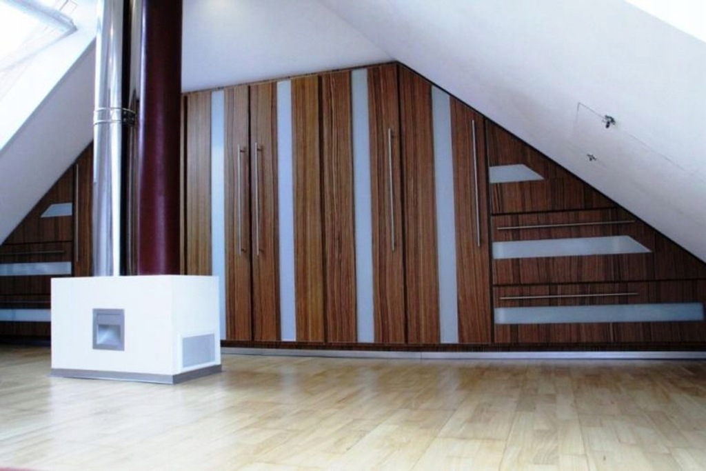 Na drugie piętro, wprost z salonu, wiodą lekkie dębowe schody z balustradą ze stali nierdzewnej. Poziom ten obecnie pełni rolę przestronnej sypialni Pani i Pana domu. Jest to pomieszczenie wyjątkowo doświetlone (aż 6 okien dachowych), którego jedną część stanowi bardzo duża garderoba wykonana z dopasowanych stylowo do mebli sypialnianych materiałów w kolorze zebrano i szkła. Wszystko zamówione pod wymiar przez właścicieli.
