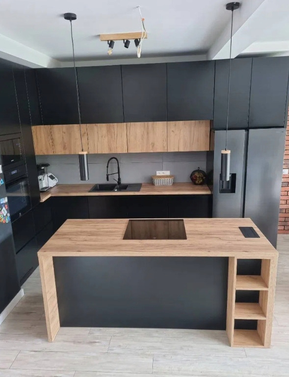 - Strefa dzienna parteru to przestronny salon z jadalnią i otwartą kuchnią z wyspą, efektownie doświetlony dużymi oknami oraz z dużym wyjściem na taras.