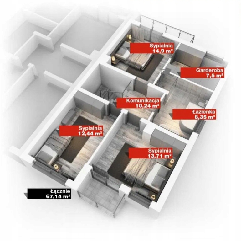 - Na piętrze znajdują się trzy duże, wygodne pokoje.