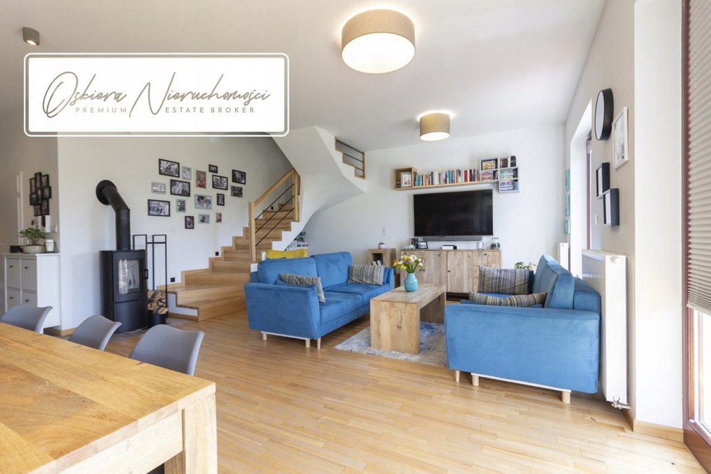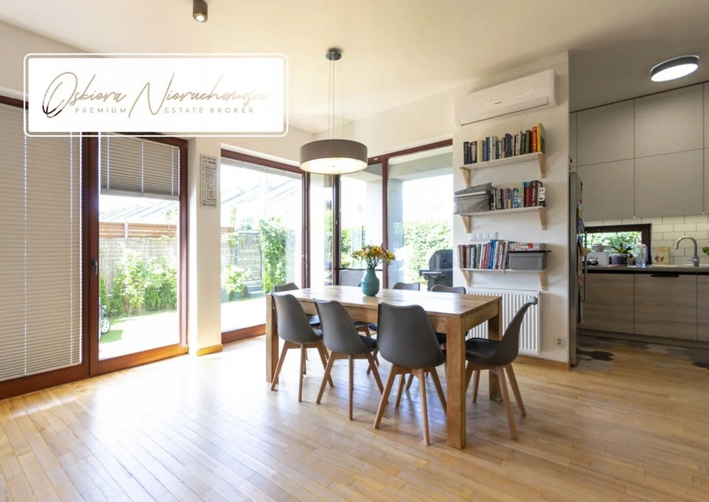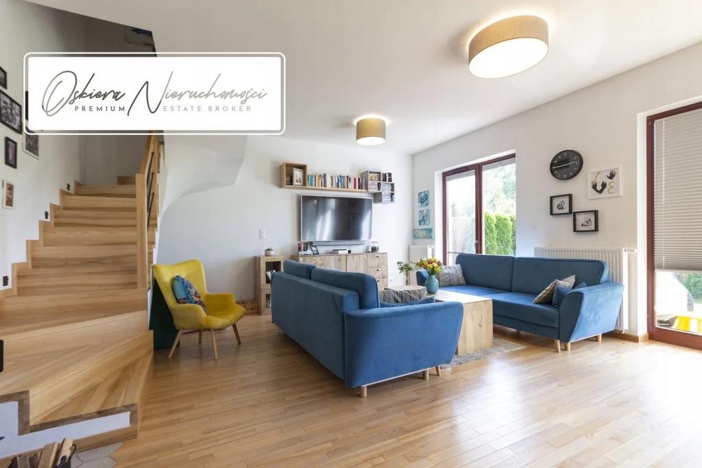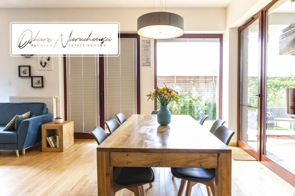 Podłogi oraz schody wykonano z desek jesionowych lakierowanych w naturalnych odcieniach. Z salonu prowadzi potrójne wyjście na 40 metrowy taras oraz do w pełni zagospodarowanego i niezwykle zadbanego ogródka o powierzchni niespełna 150 m2. Na parterze znajduje się tez 16metrowy garaż z "suchym" przejściem bezpośrednio do pomieszczenia gospodarczego i hallu.