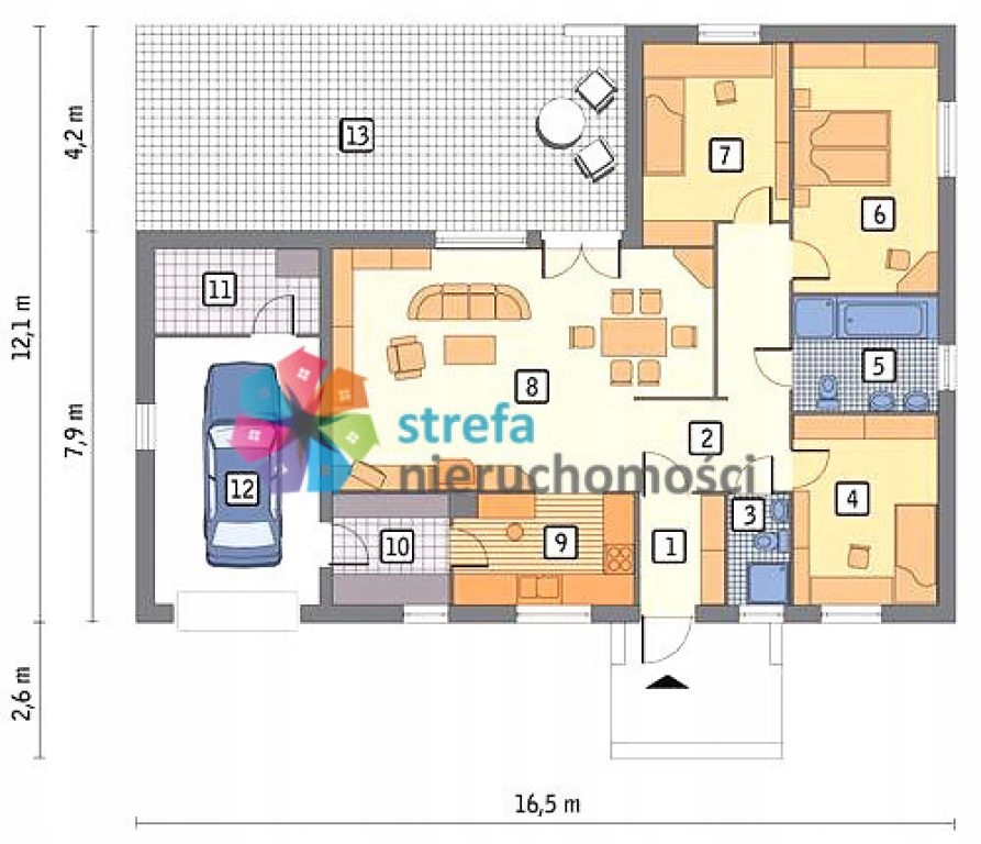 Wśród zdjęć załączony jest rzut. Układ parterowy zapewnia wygodę i komfort dla 4 osobowej rodziny.