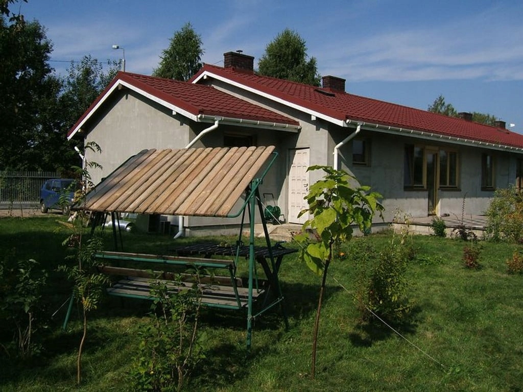 Budulec - suporex. Dom ocieplony styropianem + siatka. Kryty blachodachówką. Okna drewniane.