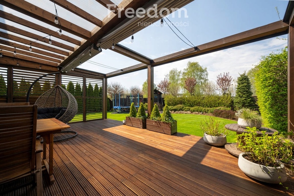Na parterze jest jasna i przytulna strefa dzienna - otwarta jasna kuchnia z funkcjonalną wyspą, część jadalna oraz salon z kominkiem. Stąd też wyjdziemy na naprawdę genialny taras. Jest zbudowany z egzotycznej deski, jego powierzchnia to aż 48 mkw. Będzie idealnym miejscem do odpoczynku w ciepłe letnie dni. Zadaszenie jest w części stałe, a w części to pergola. Po zachodzie słońca, dodatkowego uroku dodaje podświetlenie roślin w ogrodzie. Na terenie ogrodu powstał mały plac zabaw o powierzchni ok. 36 mkw.
