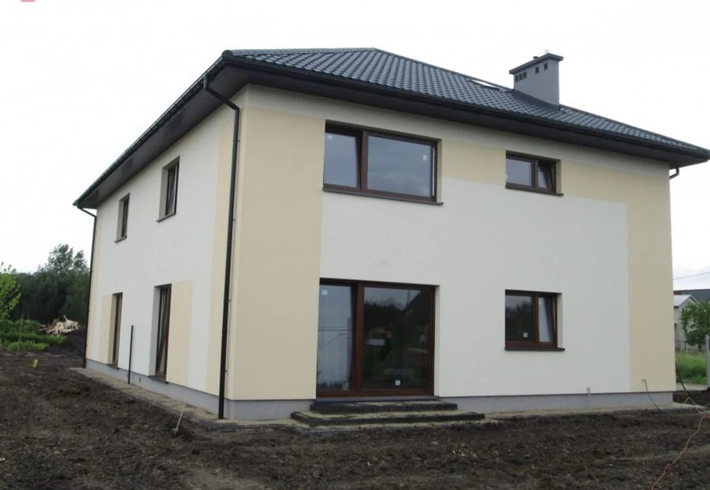 Budynek jest wykonany z porothermu gr 25 cm, na elewacji styropian gr 15 cm, nad drugą kodygnacją docieplenie poddasza welną mineralną gruności 30cm , strop żelbetowy monolityczny, okna trzy szybowe ,brama garażowa segmentowowa w kolorze okien, na dachu blachodachówka .