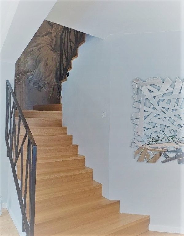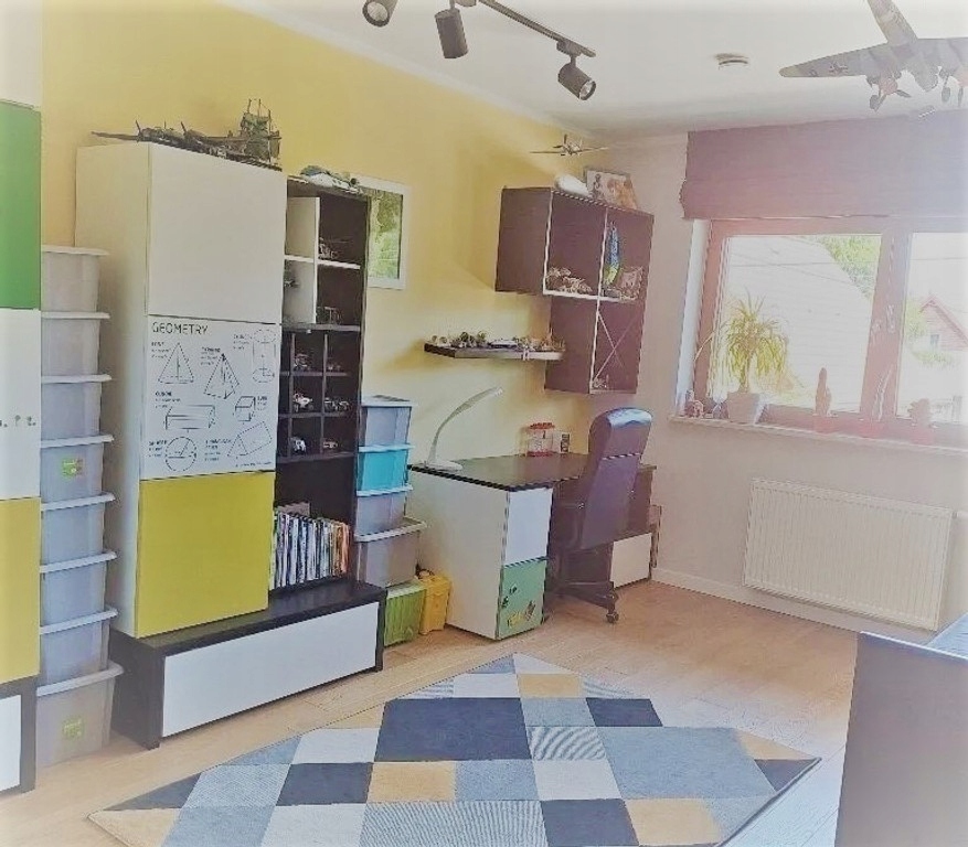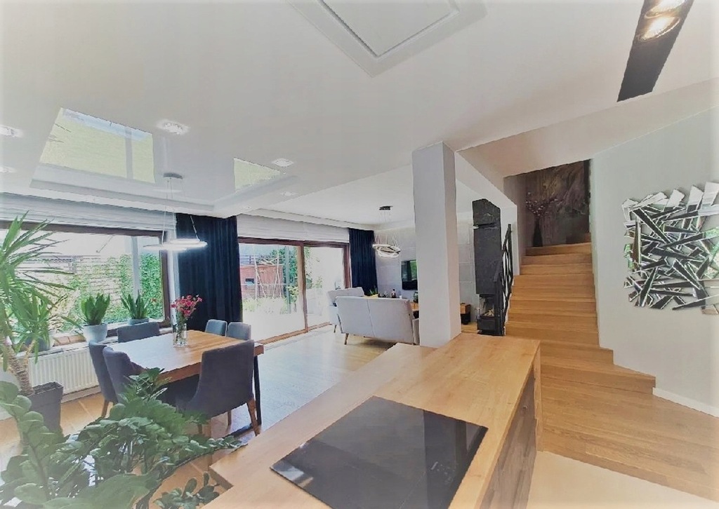 Ekologiczny dom jednopiętrowy typu bliźniak z pięknym zadaszonym tarasem wychodzącym na ogród. W salonie kominek oraz szerokie okna przesuwne z wyjściem na ogród. Nowoczesne wykończony z ogrzewaniem podłogowym w łazienkach, kuchni oraz korytarzu. Do dyspozycji: instalacja fotowoltaiczna 10kW, system rekuperacji energii cieplnej, klimatyzacja na parterze, system filtrów wody, odkurzacz centralny, światłowód. Ogród wyposażony w system nawadniania. Dom do sprzedaży z umeblowaniem. Garaż jednomiejscowy w bryle budynku, dodatkowe miejsce postojowe na podjeździe na terenie posesji.
