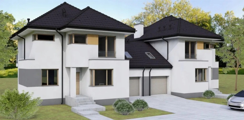Dom jednorodzinny w zabudowie bliźniaczej połączony z sąsiadem jedynie garażem.