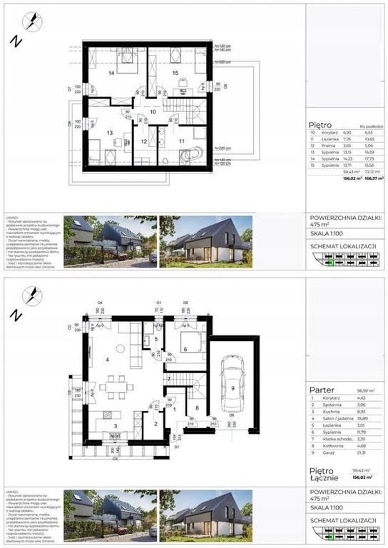 - na piętrze: 3 sypialnie (13,15+14,23+13,71 m2), dużą łazienkę (7,76 m2) i pralnię.