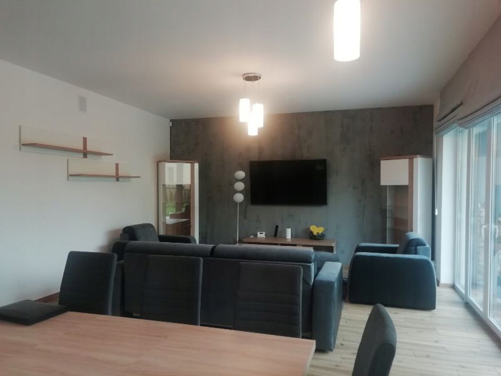 Na parterze mieści się duży klimatyzowany salon z otwartą kuchnią i jadalnią , spiżarka, pokój typu gabinet , łazienka z prysznicem oraz przejście do garaży i pomieszczenia technicznego w którym umiejscowiony jest piec dwu funkcyjny i pralnia ,