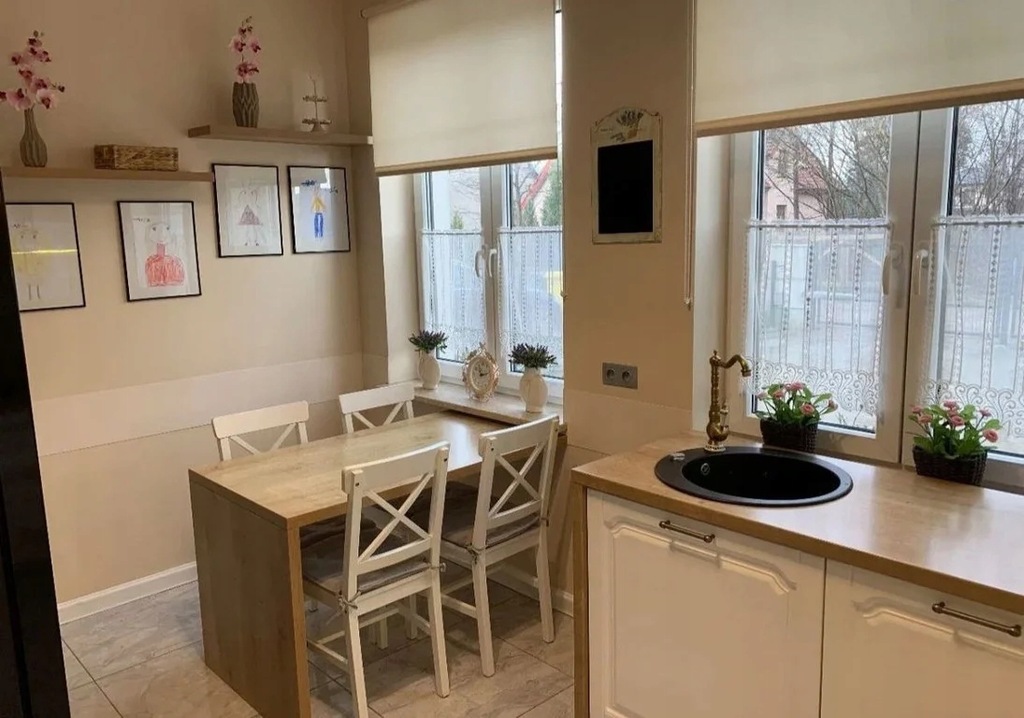 - kuchnia (10,85m2, ogrzewanie podłogowe) z pełnym wyposażeniem w którego skład wchodzą sprzęty AGD (lodówka, piekarnik, płyta indukcyjna, okap) oraz białe meble z blatem w kolorze jasnego drewna
