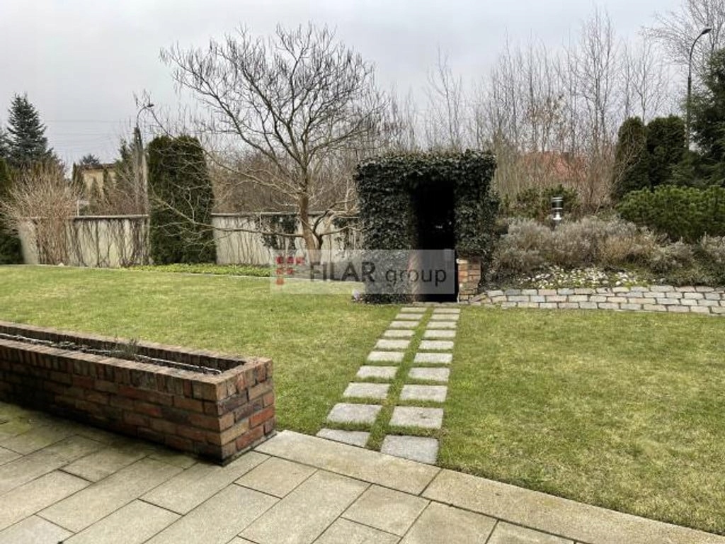 Dom wtopiony jest w pięknie urządzony i zagospodarowany ogród z wieloma ciekawymi nasadzeniami. Cały ogród ma nawodnienie i oświetlenie. Z ogrodu na taras o powierzchni 80 m2 wchodzi się bez schodów,a następnie wejściem tarasowym do salonu połączonego z jadalnią (50 m2).