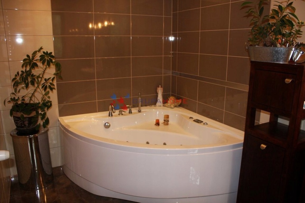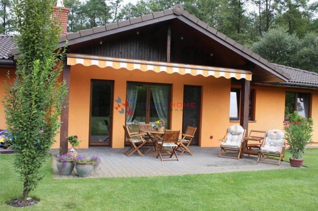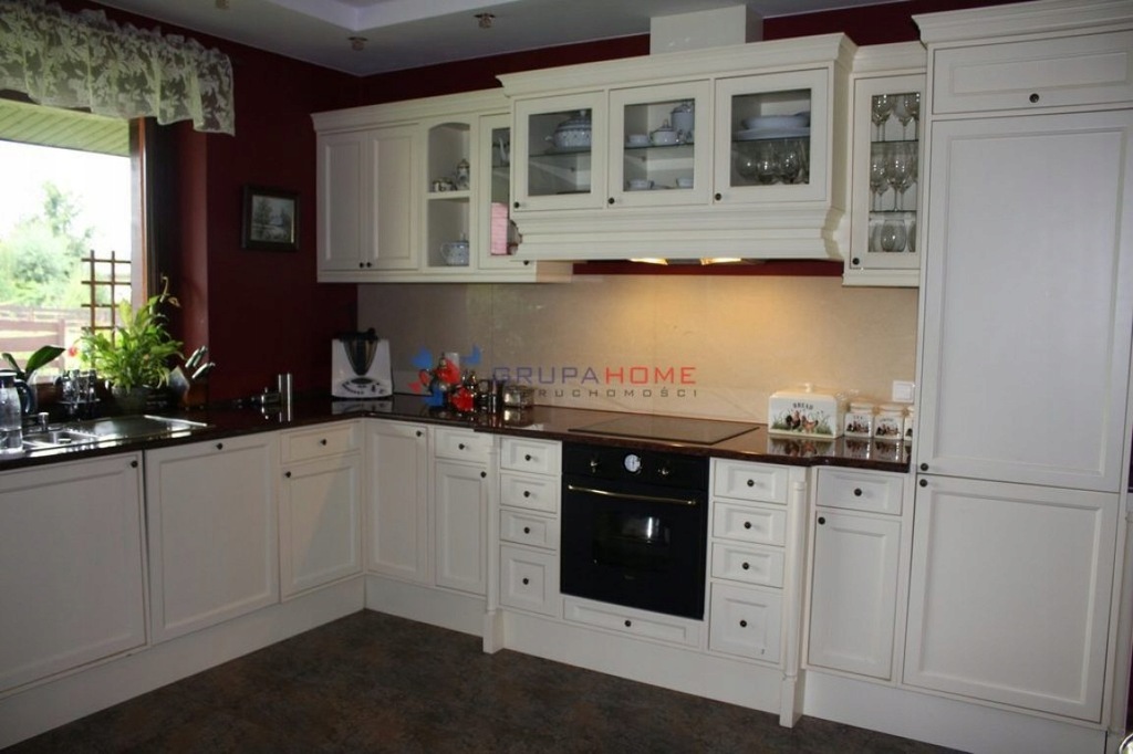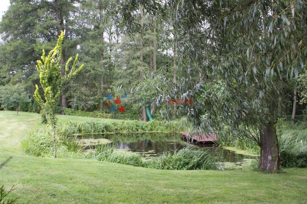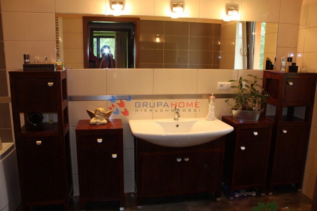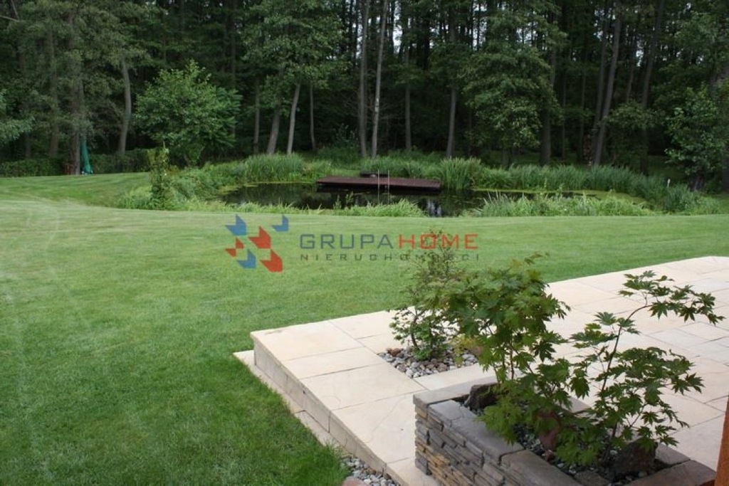 Obok domu garaż na dwa samochody o powierzchni 50 m2 . Całość usytuowana na działce budowlanej 4900 m2, położonej w sąsiedztwie Lasu Chojnowskiego. Na działce znajduje się staw, a granicą naturalną jest rzeka Tarczynka. Dom wybudowany z cegły porotherm, ocieplony styropianem grubości 15cm. Dach pokryty dachówką betonową. Kuchnia w pełni wyposażona, z szafkami w zabudowie w stylu stara Anglia, blaty granitowe, z kuchni wyjście na dodatkowy taras. W domu znajduje się duży salon z kominkiem i wyjściem na główny taras oraz ogród, trzy sypialnie, dwie garderoby 3m2 i 7m2 oraz dwie łazienki 3m2 i 7m2. Działka z systemem nawadniania, własną studnią głębinową, całość ogrodzona. Ogrzewanie na olej opałowy, piec firmy Buderus z pełną automatyką (w trakcie gazyfikacja), kominek z rozprowadzeniem ciepłego powietrza do wszystkich pokoi, co daje możliwość bardzo oszczędnego ogrzewania domu. Nieruchomość wybudowana wyjątkowo starannie z dbałością o szczegóły. Okna drewniane mahoniowe, podłoga z drewna egzotycznego (jatoba olejowana). Reszta podłogi kamiennej z ogrzewaniem podłogowym. Na działce znajduje się drewniany domek ogrodnika na narzędzia i kosiarki oraz wiata na drewno. W odległości 2 km sklep, przystanek autobusowy, szkoła.