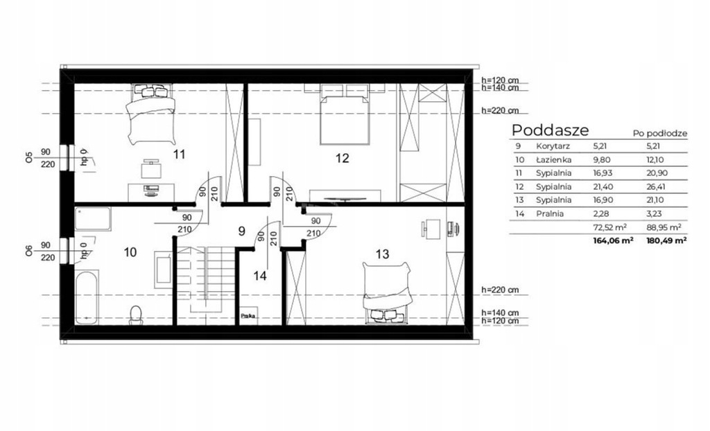 Piętro domu składa się (metraż po powierzchni podłogi):