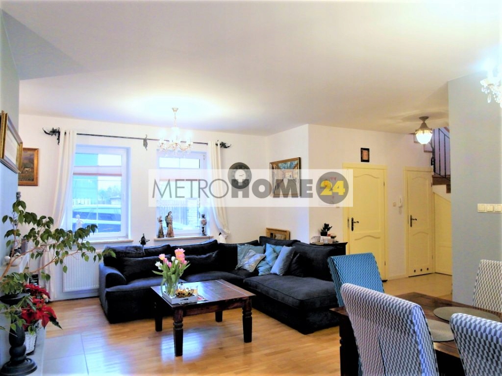 Do sprzedaży elegancki bardzo dobrze wykończony dwukondygnacyjny segment usytuowany w Piasecznie na kameralnym strzeżonym osiedlu . Na parterze domu znajduje się salon z kominkiem (305 mkw) oddzielna kuchnia (75 mkw) z oknem (w pełni urządzona i wyposażona w sprzęt AGD) wiatrołap (25 mkw) łazienka (21 mkw) oraz hall (ok. 115 mkw). Na piętrze mamy trzy pokoje (16; 14; 97 mkw) w tym sypialnia z prywatną łazienką z wanną (56 mkw) druga łazienka (55 mkw) z prysznicem hall (97 mkw). Optymalny i bardzo funkcjonalny rozkład pomieszczeń. Dom jest elegancki ładnie wykończony bardzo dobrej jakości materiałami - gustowne połączenie klasyki z nowoczesnością. Eleganckie łazienki nowoczesny kominek obudowany kamieniem w pokojach na podłogach parkiet dębowy w kuchni i hallu - gres. Ogrzewanie podłogowe w kuchni i łazienkach. Ogródek z zaaranżowaną roślinnością tarasem z markizą oraz stolikiem z krzesłami. Bardzo dobre połączenie z Warszawą. W najbliższej okolicy pełna infrastruktura Auchan restauracje sklepy przedszkola szkoły. Polecam i zapraszam na prezentację.Metrohome24 świadczy bezpłatne pośrednictwo w uzyskaniu kredytu na zakup nieruchomości współpracujemy z 24 bankami. Zadzwoń zapytaj o szczegóły.