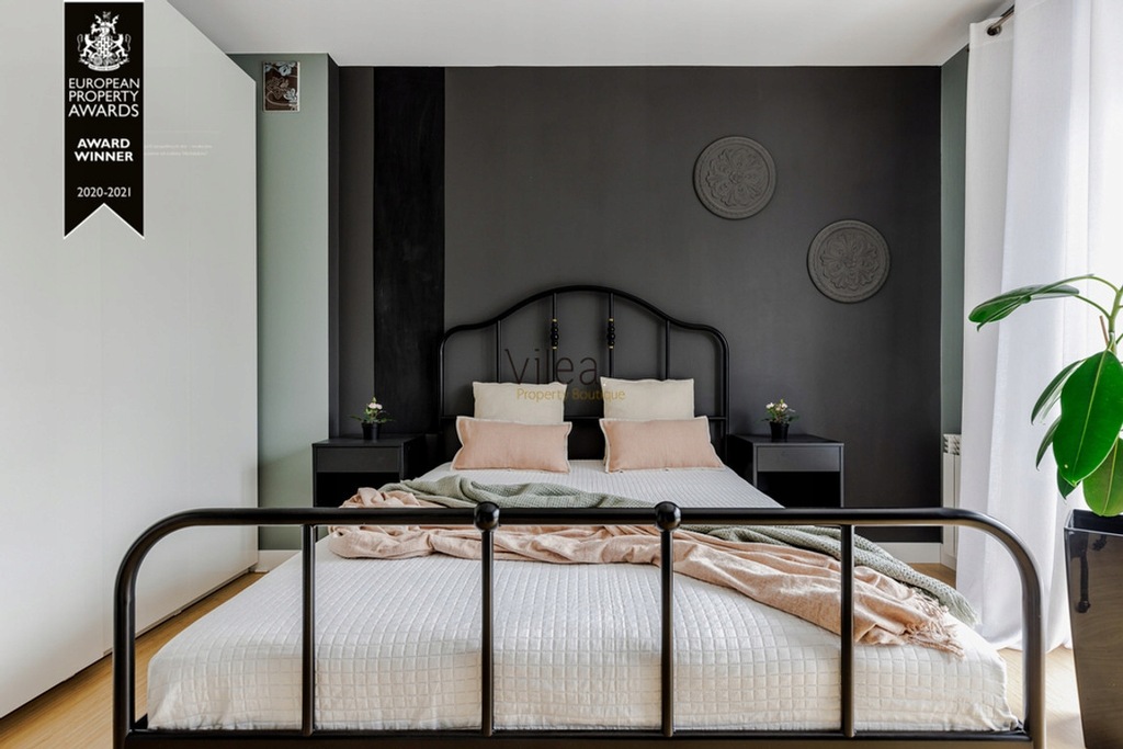 - A bedroom with a large, comfortable bed and a spacious built-in wardrobe with an exit to the terrace,