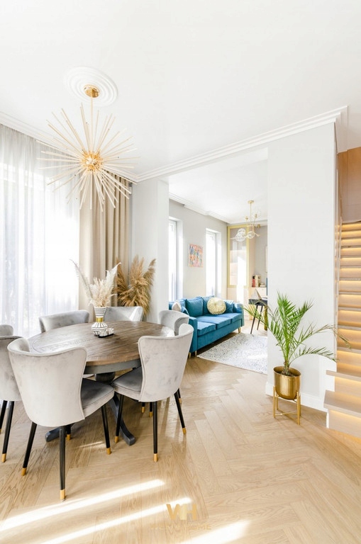 Dom jest bez dwóch zdań wyjątkowy i wykonany z najwyższej jakości materiałów, jest w 100% dopieszczony oraz zadbany (pokusiłabym się o słowo wymuskany). Na podłodze znajdziemy deskę dębową, marmur, granit a w kuchni spiek. Standard wykończenia oraz dbałości o szczegóły daje nam 100% komfortu użytkowania oraz wyglądu. Nieruchomość posiada piec gazowy. Otacza ją 50m2 tarasu z deski tarasowej z paleniskiem na którego wyjścia znajdują się od 2 stron salonu oraz kuchni. Jest on podzielony na 2 strefy: wypoczynkowa i jadalna. Dodatkowo znajdziemy tu garaż, który bez problemu mieści jedno, duże auto + funkcję schowka lub 2 małe auta.