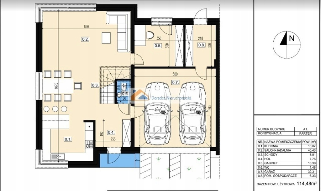Parter: kuchnia z jadalnią, salon, gabinet, hol, wc, garaż na 2 samochody, pomieszczenie gospodarcze