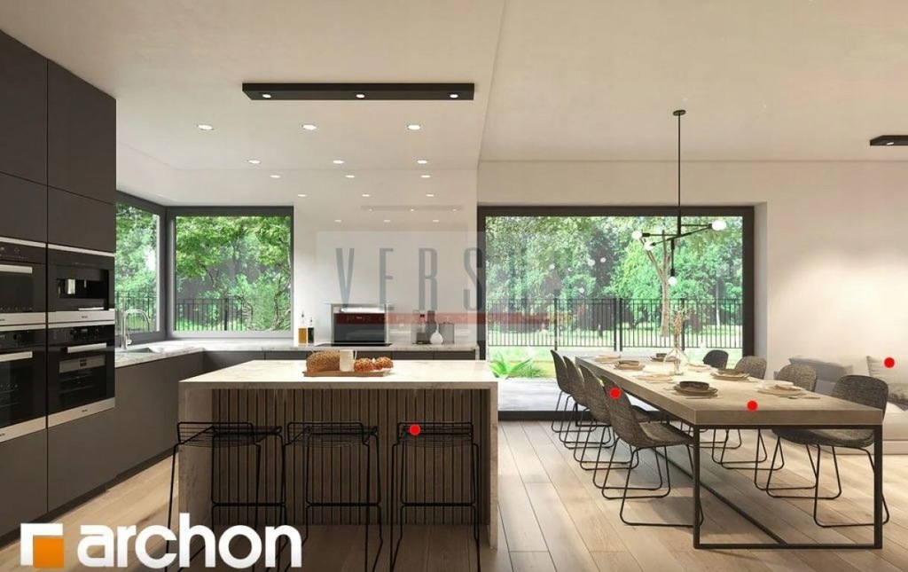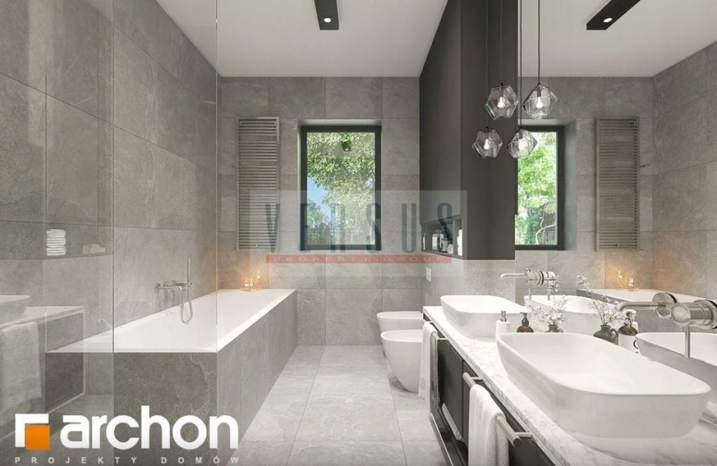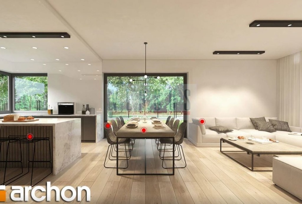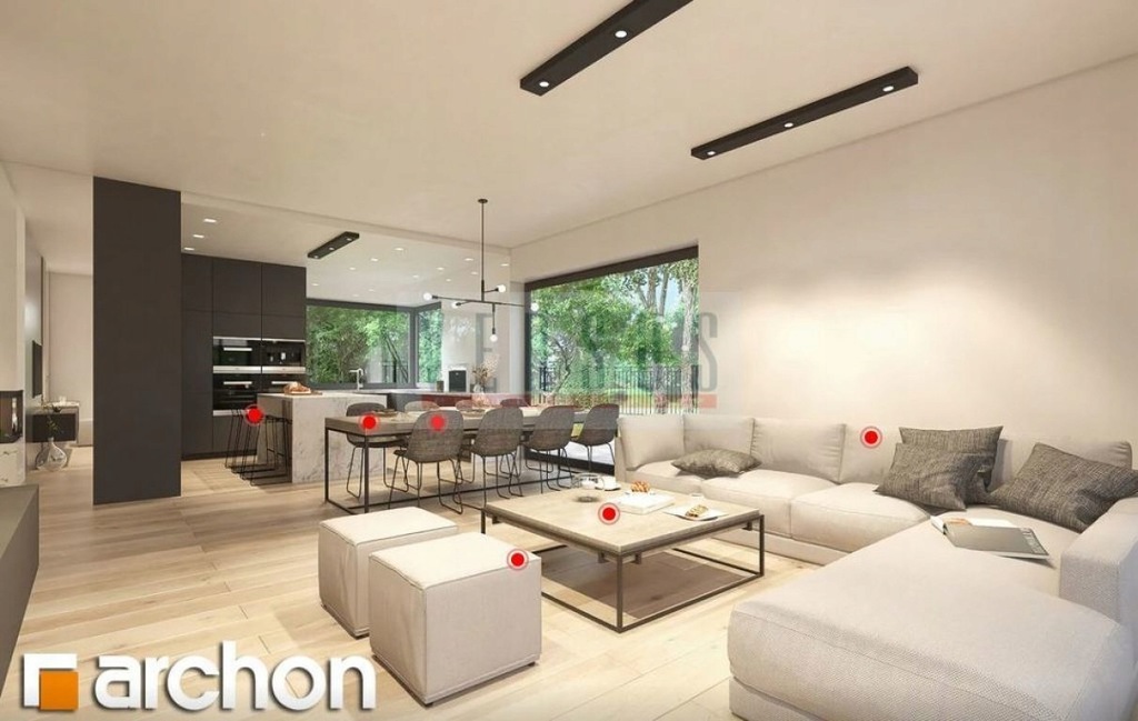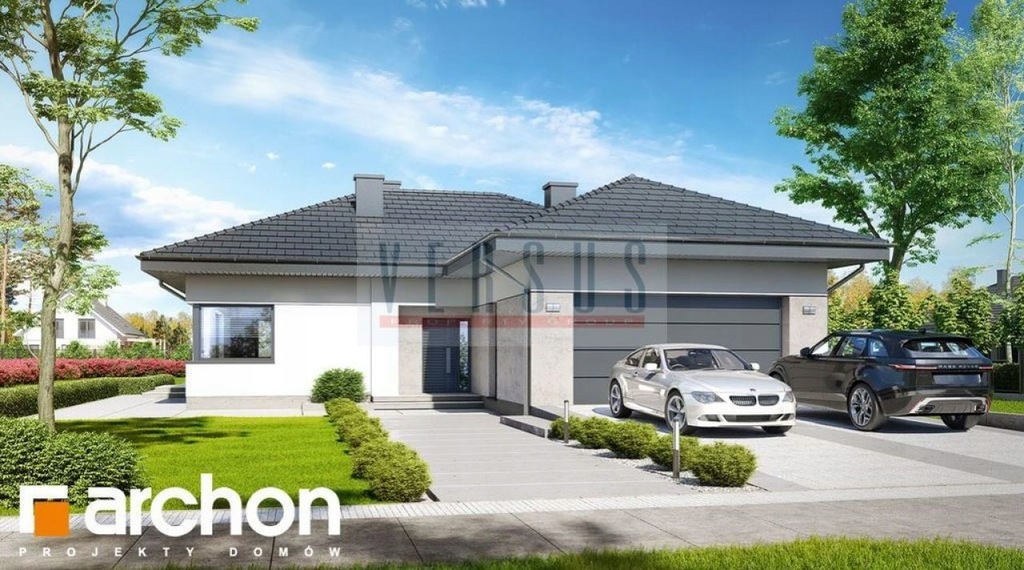 To projekt domu parterowego z dwustanowiskowym garażem, będący doskonałym połączeniem funkcjonalności i nowoczesnej estetyki. Kompozycja elewacji to odpowiadająca aktualnym trendom modna paleta barw, w której biały tynk został przełamany betonową okładziną, a mocniejszy akcent wprowadza grafitowa stolarka i dachówka. Wysunięty przed linię elewacji frontowej garaż, swobodnie mieści dwa samochody. Przestrzeń tarasową przesłonięto nowoczesną pergolą, tworząc atrakcyjne miejsce relaksu z letnią jadalnią oraz ogrodową, narożną sofą. Taras został płynnie połączony z wnętrzem i jest dostępny z różnych części domu. Do rodzinnego wypoczynku w salonie zaprasza narożna sofa, a słoneczna jadalnia mieści duży stół, który w trakcie większych uroczystości można dodatkowo rozsunąć. W centrum otwartej kuchni zaprojektowano wyspę, która może pełnić funkcję barku śniadaniowego oraz dodatkowego blatu roboczego. Kuchnię uzupełnia praktyczna spiżarnia, w której wygodnie można przechowywać zapasy spożywcze. W pobliżu strefy dziennej przewidziano łazienkę. Zaciszna przestrzeń prywatna domu obejmuje komfortowy apartament główny z łazienką, garderobą i szerokim wyjściem na taras oraz dwa pokoje dla dzieci i gabinet, które również mają bezpośredni dostęp do ogrodu. Wspólna dla wszystkich mieszkańców łazienka dopełnia program użytkowy części nocnej. Z korytarza oraz wiatrołapu dostępna jest kotłownia gazowa, którą połączono z funkcją pralni, stąd można szybko przejść do dwustanowiskowego garażu.