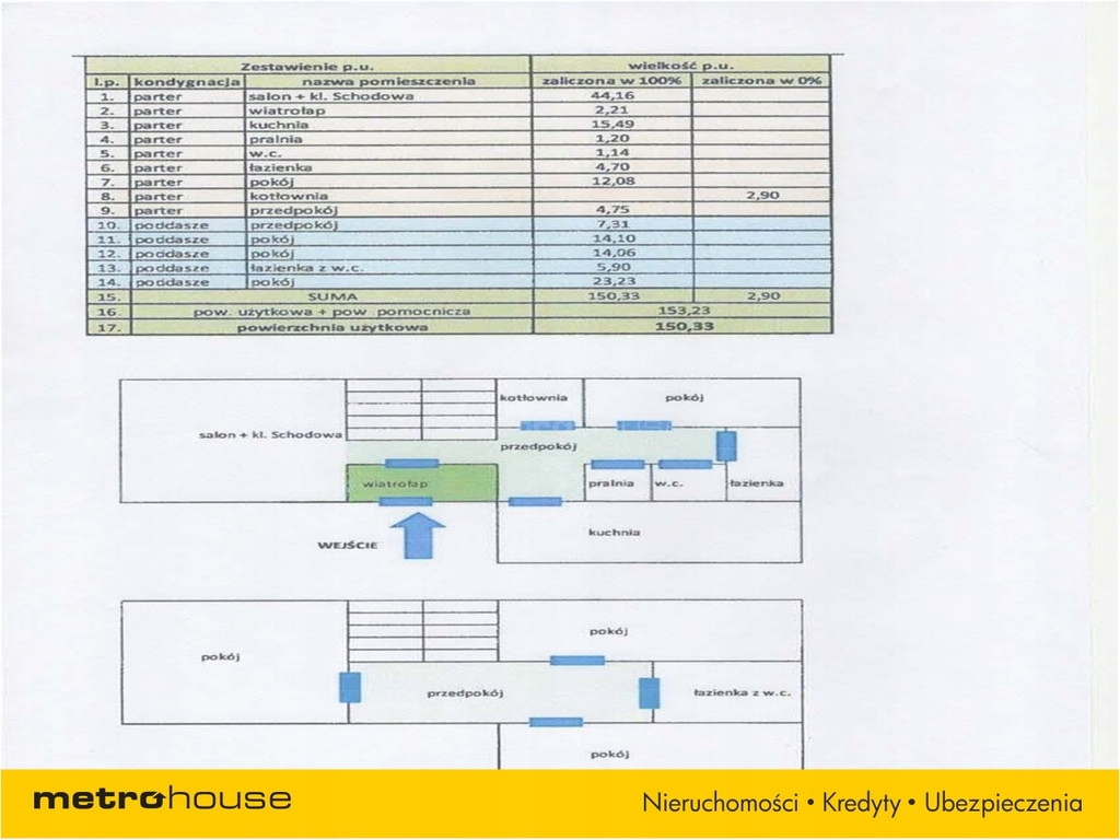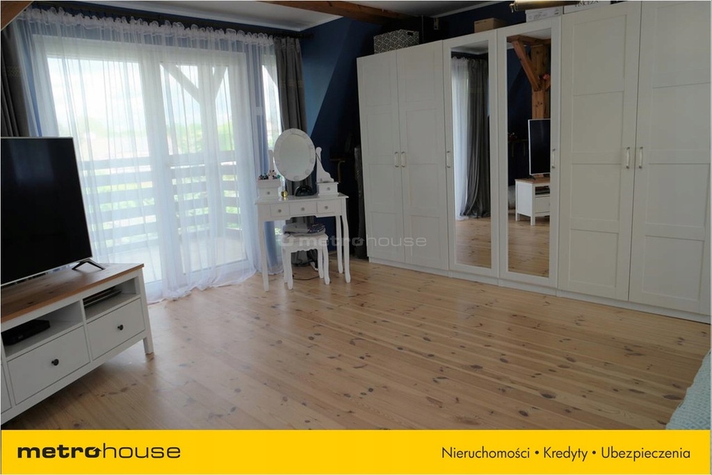 Dom został wybudowany w 2000 roku, składa się z dwóch kondygnacji o powierzchni użytkowej 150 mkw, usytuowany jest na działce 1375 mkw. W X.2020 r. wykonano generalny remont. Ściany jednowarstwowe z pustaka Ytong 50 cm. Okna PCV firmy Termoplast, dachowe drewniane firmy VELUX. Zabudowa kuchni wykonana na zamówienie, wyposażona w wysokiej jakości sprzęt.W pokojach na podłodze położona jest lita deska sosnowa. Na parterze znajdują się: wiatrołap 2,21 m2 z dwudrzwiową szafą przesuwną,przedpokój 4,75 m2, salon 44,16 m2, z dębowymi schodami prowadzącymi na piętro. Z salonu jest wyjście na taras z ogrodem, kotłownia 2,90 m2, pokój 12,8 m2,łazienka 4,70 m2,WC 1,14 m2, pralnia 1,20 m2, kuchnia 15,49 m2. Na poddaszu znajdują się: przedpokój 7,31 m2 z dużą szafą przesuwną, trzydrzwiową z lustrem, sypialnia 23,23 m2 z dużym balkonem, w drewnianej zabudowie, wychodzącym na stronę tarasu,pokój 14,10 m2, pokój 14,06 m2, łazienka z WC 5,9m2.
