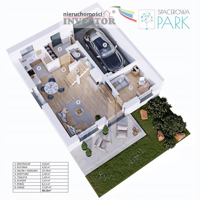 - przestronny salon z jadalnią i wyjściem na ogród,