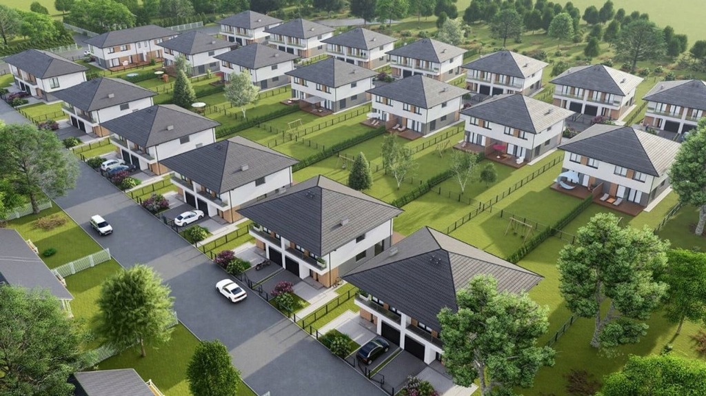 1 etap inwestycji składający się z 14 domów usytuowanych wzdłuż drogi gminnej, dzięki czemu posiadają niezależne wjazdy na posesję. Każdy z domów jest w pełni ogrodzony, z możliwością wejścia przez furtkę i wjazdu przez przesuwną bramą wjazdową.