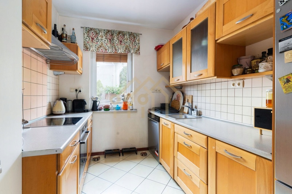 Kuchnia - umeblowana z dwóch stron, duże okno, zmywarka w zabudowie, kuchenka elektryczna, okap, lodówka, zlew.