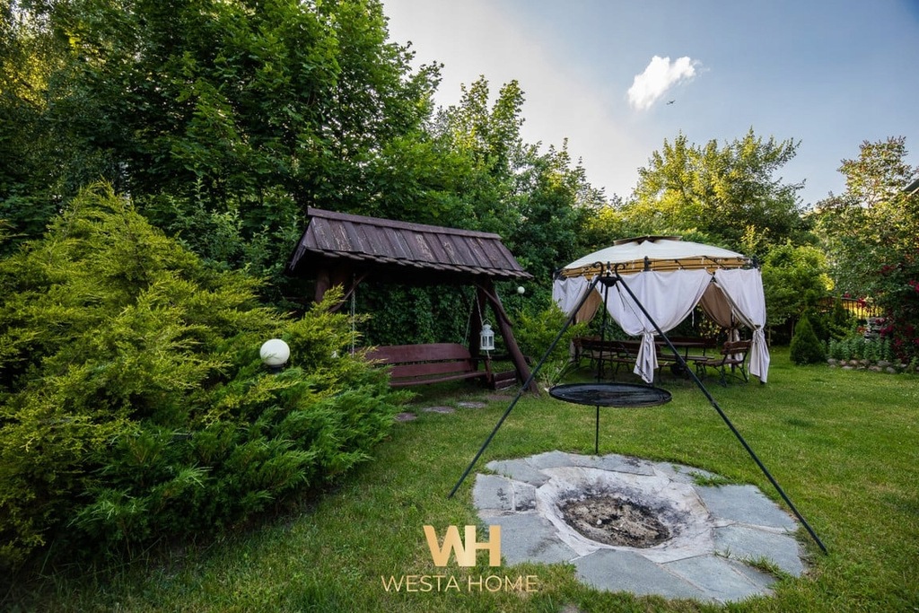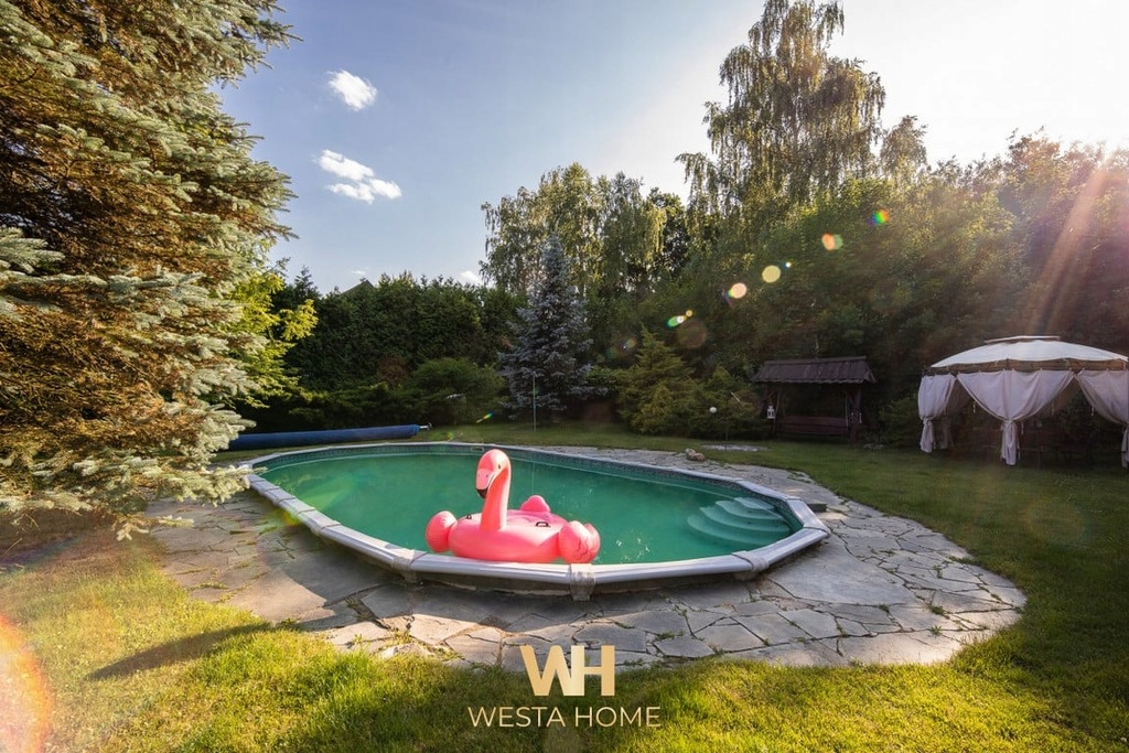 Na przestronnej działce o metrażu 1646m2 mieści się mądrze rozplanowany ogród z basenem przydomowym oraz ogródkiem z owocami i warzywami.
