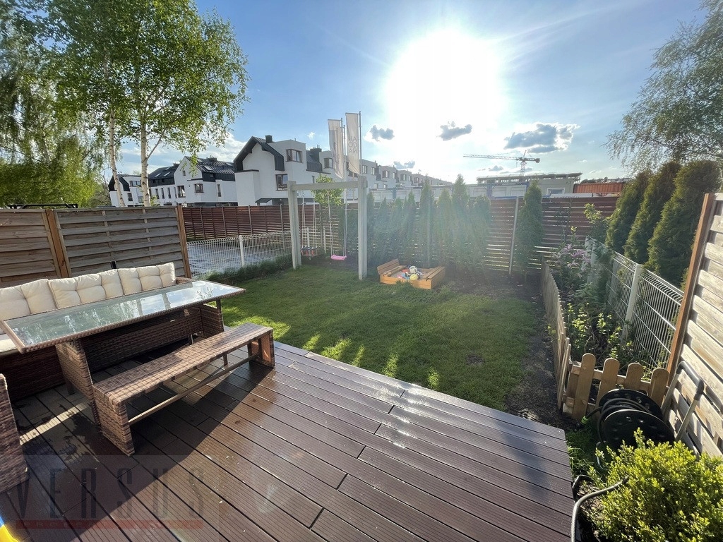 Ogródek o powierzchni około 65 m2 z tarasem (15 m2) wykonanym z deski kompozytowej; wyprowadzone przyłącze wody z kranem do podlewania oraz gniazdka elektryczne. Została zrobiona podwójna drewniana huśtawka oraz piaskownica.
