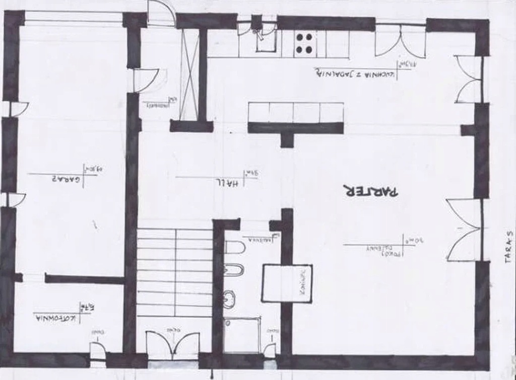 Parter: salon z kominkiem, kuchnia, jadalnia, łazienka, przedpokój, hall, garaż, kotłownia i pralnia. Oprócz tego taras i ogród.