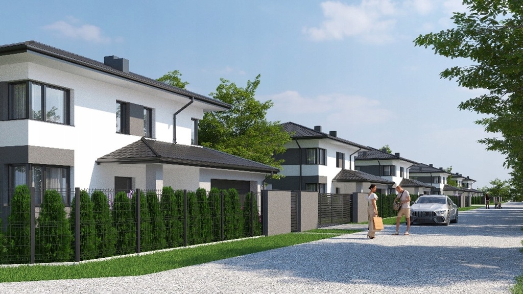 Każdy z domów posiada powierzchnię garażową dostosowaną do swobodnego zaparkowania dwóch pojazdów.