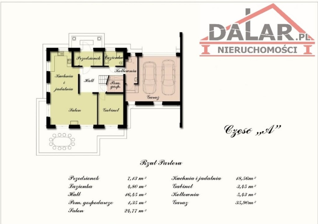 Na parterze przewidziano duży pokój/gabinet (aktualnie jest on przedłużeniem salonu, na życzenie klienta ścianka działowa zostanie wykonana).