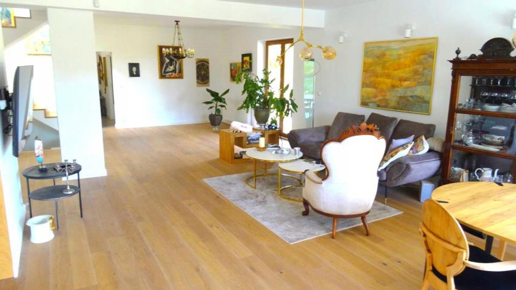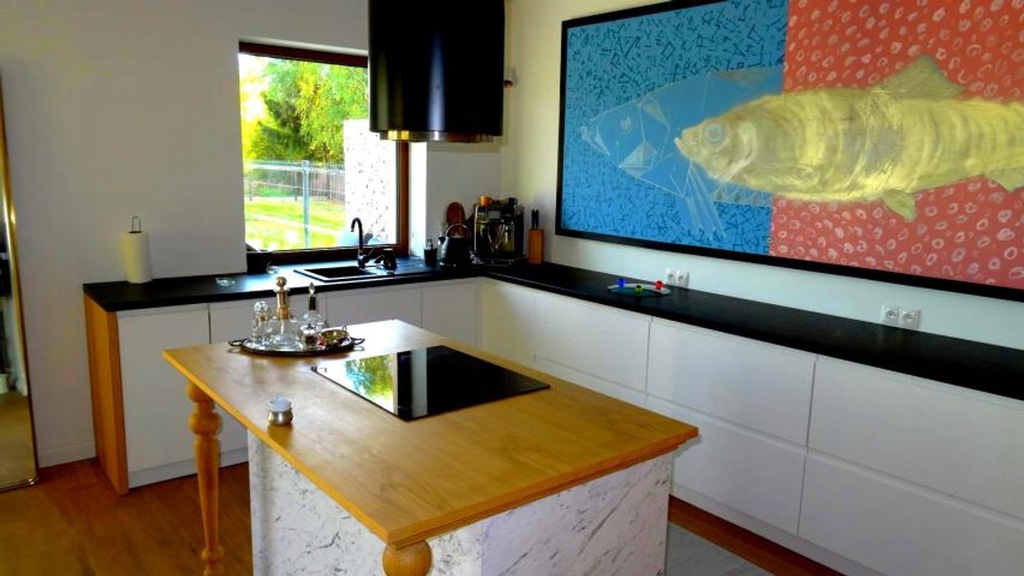 - piękna otwarta przestrzeń ok. 75m2 zawierająca kuchnię z wyspą, jadalnię, salon oraz miejsce na bibloiteczkę