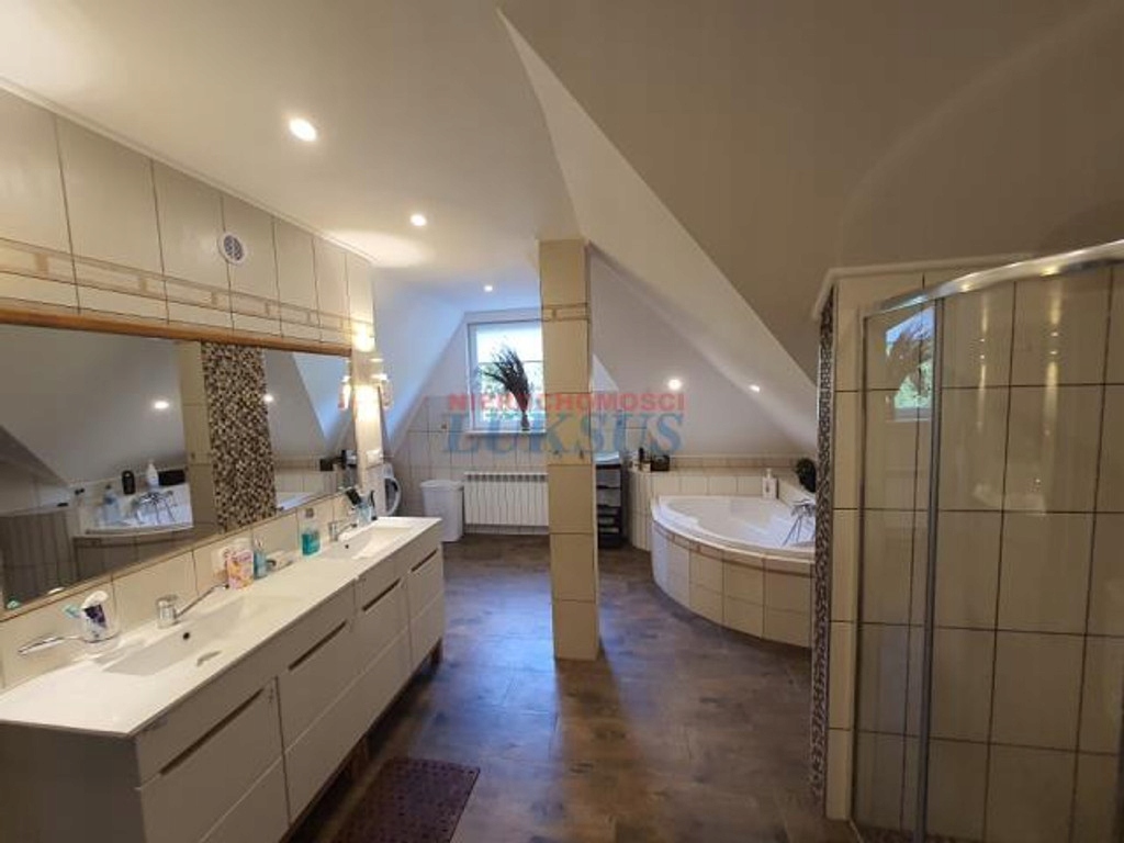 Do sprzedaży ładna zagospodarowana działka gruntu o powierzchni 1800m2 zabudowana domem jednorodzinnym o pow. ok. 260m2. przy ruchliwej drodze. Parter - salom - 35,25m2. Podłoga z jasnego dębu, deska barlinecka pływająca. Nowy kominek, z rozprowadzeniem ciepła do niektórych pomieszczeń domu. Na ścianie 65" TV Philips Ambilight. JADALNIA - 13,85m2 - podłoga jak w salonie. 5 okien w tym jedno pojedyncze balkonowe, można nim wyjść na mały tarasik lib zejść po schodkach do ogrodu. KUCHNIA - 16,35m2 wyposażona w zupełnie nowe meble (folia), nowa czarna zmywarka, zlewozmywak z konglomeratu, czarny kran, czarny pochłaniacz. Podłoga i ściany GRES. HALL -13,65m2, szafa trzysegmentowa, o powierzchni ok. 3m2. POKÓJ GOŚCINNY - 15m2. Podłoga to pływająca deska barlinecka, ciemny dąb, wymaga renowacji. ŁAZIENKA - 6,3m2 wyposażona w podwójną kabinę prysznicową, meble łazienkowe, pralkę. Terracota i glazura w kolorze latte. KABINA WC - 1,7m2 MAŁY PRZEDPOKÓJ - 4,8m2. POMIESZCZENIE GOSPODARCZE Z KOTŁOWNIĄ - 3,9m2, wyposażone w piec firmy VIESSMANN, VITOPEND 100 oraz 2 regały do przechowywania. WIATROŁAP -3,5m2 wykończony imitacja kamienia. Szafka na buty, skrzynki z bezpiecznikami. SCHODY - dębowe, 17 stopni, szerokość 120cm. PIĘTRO Na całym piętrze podłoga sosnowa na legarach, cyklinowana we wrześniu 2021. HALL REKREACYJNY - 23,65m2, wyposażony w zestaw mebli z IKEA. Kanapa i 2 szezlongi pozwalają na wygodne oglądanie nowości w TV. Pomieszczenie to ma 2 ściany, reszta to przestrzeń otwarta z dostępem do niewielkiego 3,5m2 tarasu z widokiem na ogród. NAJMNIEJSZA SYPIALNIA - 18,62m2, 2 okna w tym 1 balkonowe prowadzące na 14m2 taras. DRUGA SYPIALNIA - 21,4m2 - również 2 okna, 1 balkonowe z wyjściem na taras. GARDEROBA - ogólna powierzchnia 13m2, wyposażona w szafę ścienną, jednak nadal może służyć jako sypialnia. Szerokość między szafą a ścianą to 2m a długość pokoju ponad 4m. NAJWIĘKSZA SYPIALNIA - 26,2m2, wyposażona w 2 okna, w tym jedno dachowe. KABINA WC - 1,2m2. POKÓJ KĄPIELOWY -19,4m2, wyposażony w kabinę prysznicową z deszczownicą, wannę, zestaw mebli z dwoma umywalkami, bidet oraz trzeci już sedes. Pralka o ładowności 8kg. SIŁOWNIA - 28,8m2. Profesjonalna bieżnia, ławeczka do ćwiczeń, atlas, 2 okna dachowe, klimatyzator. Wejście na strych składanymi i chowanymi w suficie schodami. Na strychu automatyczne oświetlenie, włączające się w czasie otwierania schodów. Na tyłach domu znajduje się 36metrowy taras. 2 GARAŻE. Pierwszy o powierzchni 17,25m2 i drugi 29,55m2. W garażach czujki od instalacji alarmowej.