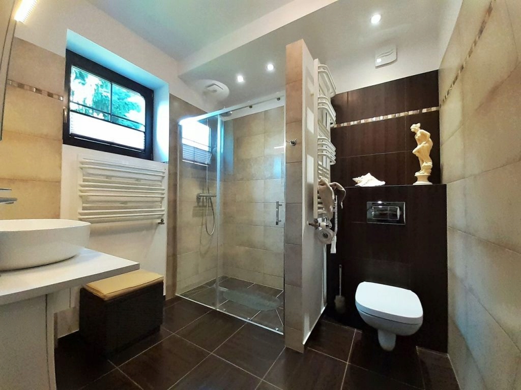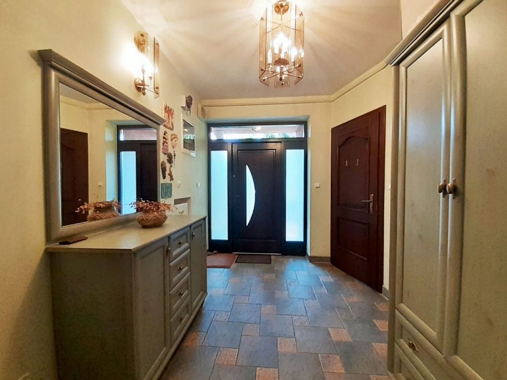 Rozkład pomieszczeń umożliwia wydzielenie 2 oddzielnych mieszkań (2 niezależne wejścia). Piękne drewniane schody łączą 3 poziomy, na których mieszczą się 4 sypialnie, salon, 3 łazienki, 2 kuchnie, garderoba.