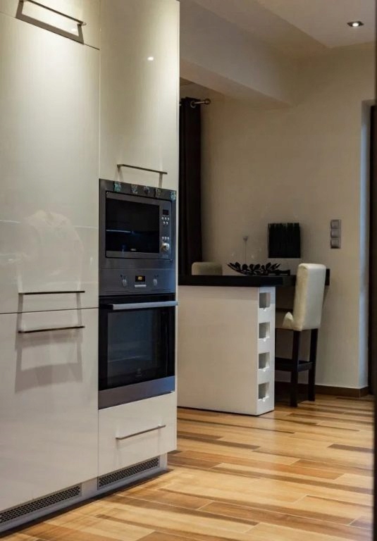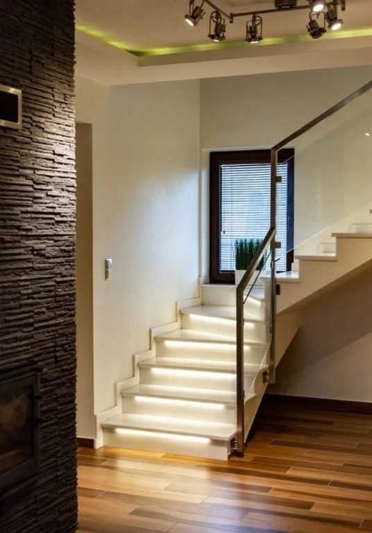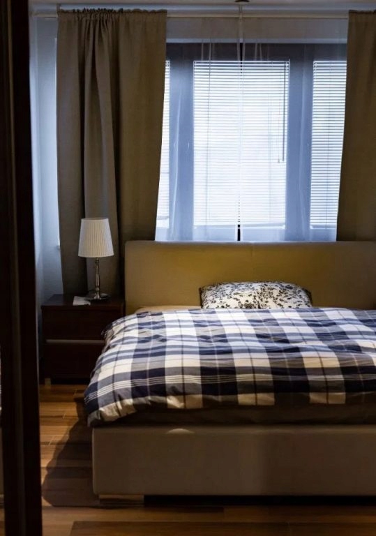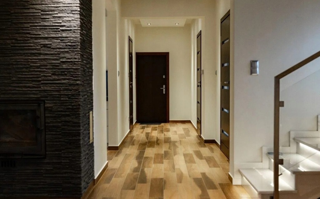 Okna drewniane.Na podłogach położono deskę z drewna egzotycznego, marmur, gress.