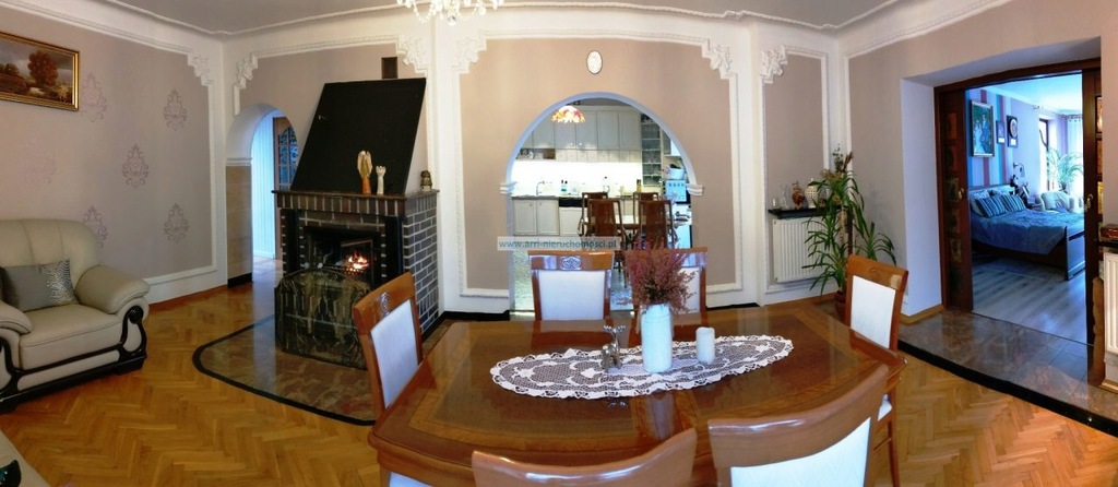 Pierwsze piętro zajmuje duży pokój dzienny (ok.26 m2; parkiet dębowy) ze strefą wypoczynkową, kominkiem, przestronna widna sypialnia (ok.30 m2; panele) w amfiladzie oddzieloną przeszklonymi drzwiami suwanymi, a z niej wyjście na taras, z którego widoczny jest ogród i część zielona miasta z parkiem i pałacem w oddali. Pokój dzienny poprzedza duża kuchnia całkowicie odnowiona w 2018 r. (ok.16 m2; płytki ceramiczne; wyposażona w zabudowaną zmywarkę, chłodziarkę z zamrażarką, kuchnię gazową z okapem – wyciągiem), połączona z zadaszonym poliwęglanowymi płytami tarasem w sposób półprzezroczysty. To miejsce pełni funkcję letniej jadalni, może służyć też jako oranżeria. W hallu znajduje się wejście do łazienki (wanna z jacuzzi, umywalka, bidet), toalety (ok. 3m2; płytki ceramiczne; muszla wc, umywalka) i garderoby (ok. 4 m2; klepka dębowa) oraz wyjście na duży taras znajdujący się od frontu budynku.